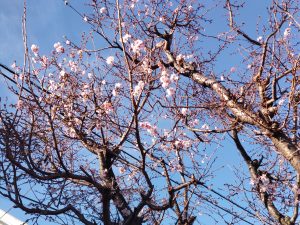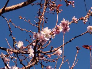この時期咲く桜は十月桜と言い控えめに枝にポツポツと花が咲きます。