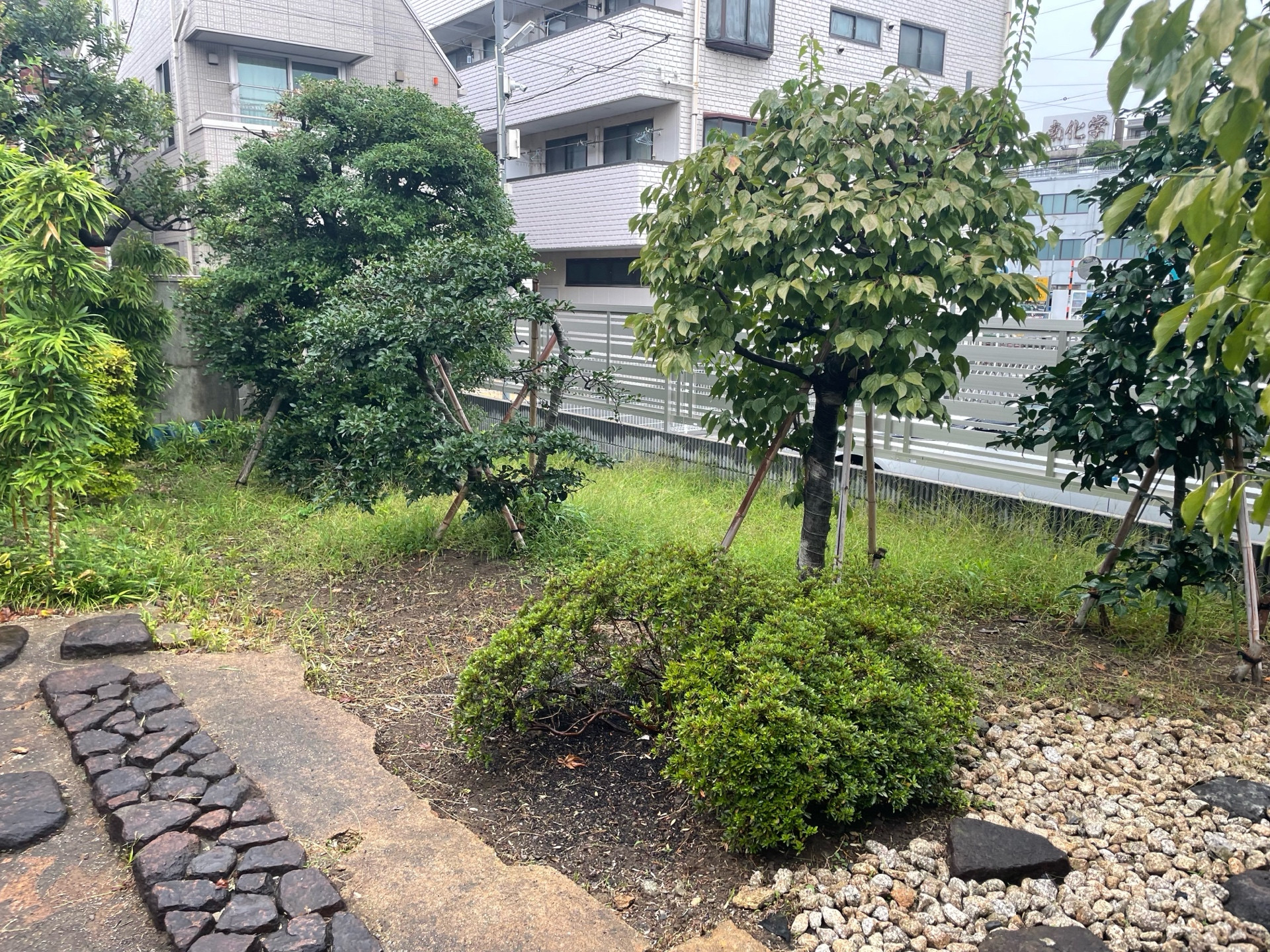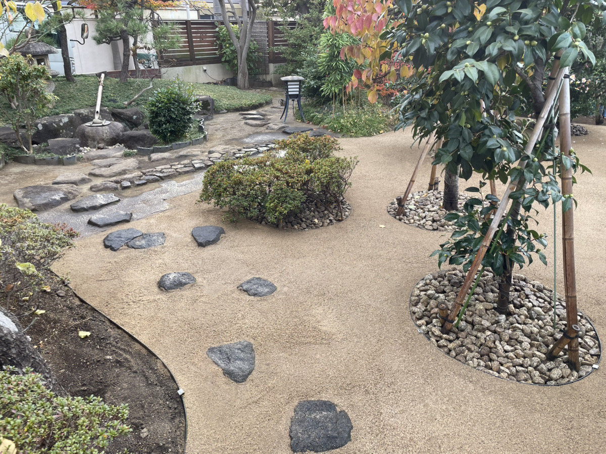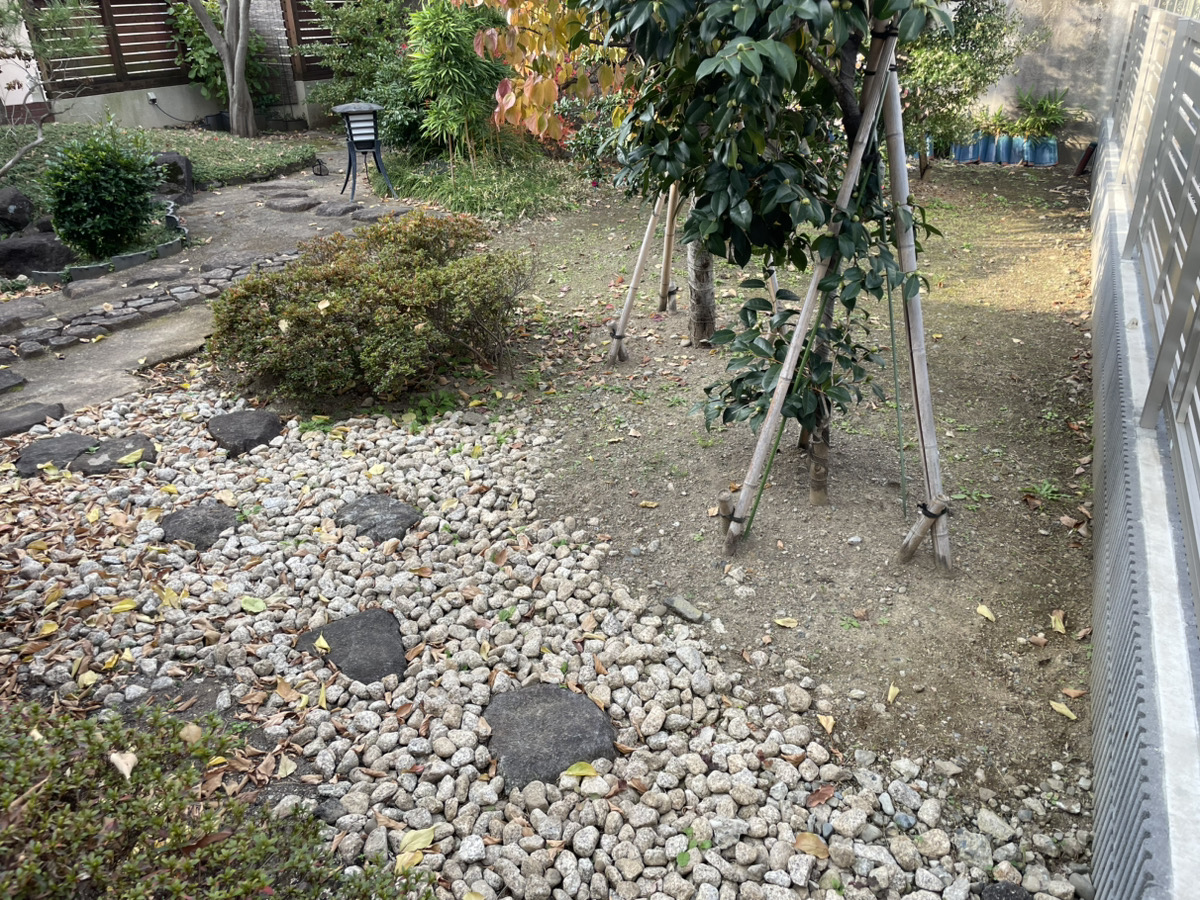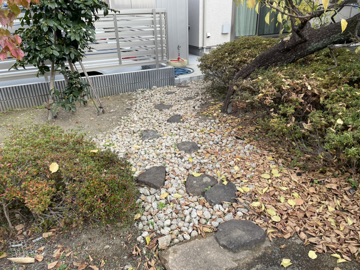 こちらのお庭に雑草対策として、マサド舗装作業を実施いたします。 雑草が生えているので、まずは草刈作業を実施いたします。 小石や不純物は取り除きます。 植木周辺は、スリムエッジという仕切り板で仕切ります。 ゴロタ石は、植木の根元に移動させます。 最後にマサドで舗装します。