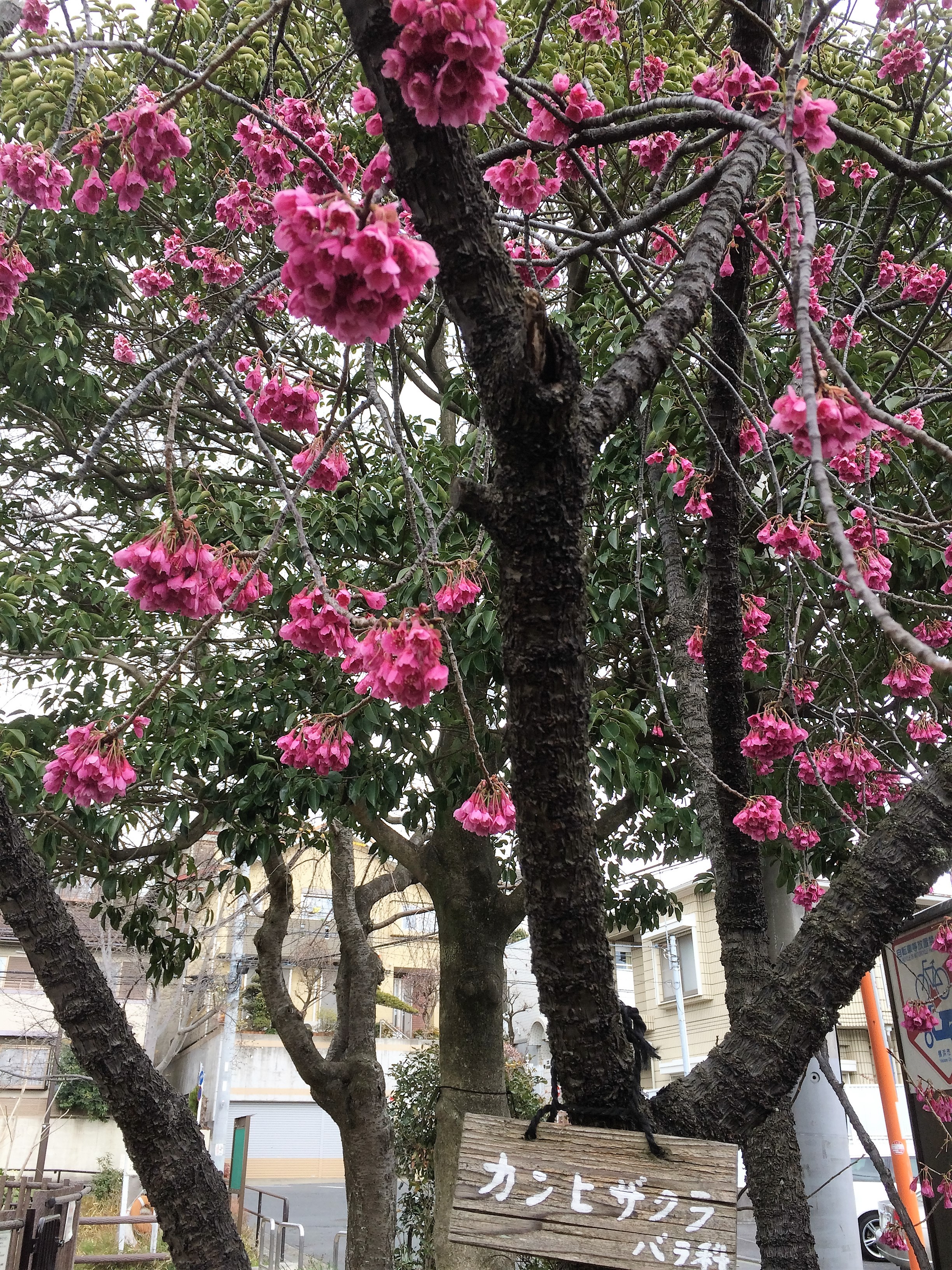 1枚目は「鈴なりに咲く寒緋桜」、2枚目は「密やかに咲くシキミの花」、3枚目は「楚々と咲く木瓜の花」」