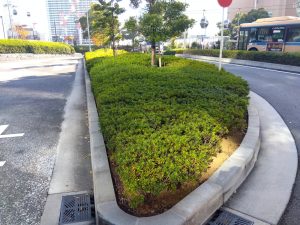 桜木町駅前バスロータリーにて、今期2度目の除草と剪定刈り込み作業を行いました。